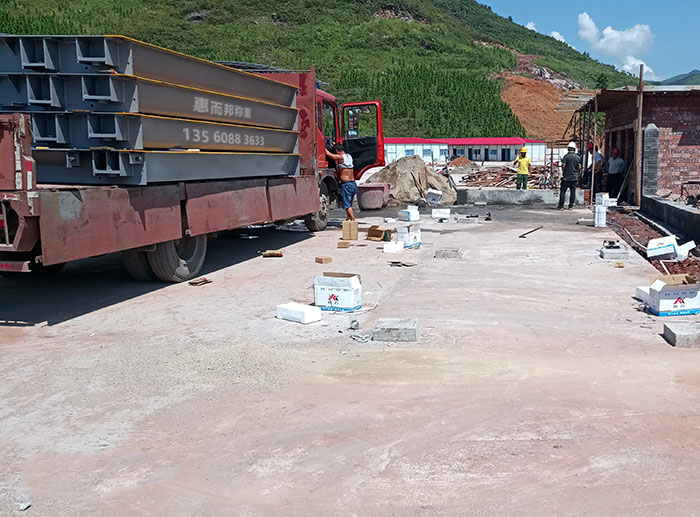 工程概況:地磅秤臺采用3.0X18M,4節(jié)U型鋼結(jié)構(gòu)秤臺6mm U型梁鋼結(jié)構(gòu)6條大梁;折彎,12mm面板。最大稱重120t,儀表顯示精度為:10KG.