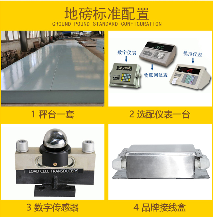 4. 接線盒----------- 作用:具有連接稱重儀表和傳輸稱重數(shù)據(jù)信號的重要職能。接線盒中的電位器可用來調(diào)整所接傳感器的激勵電壓,進而達到調(diào)整相應(yīng)傳感器輸出信號的大小,使各個傳感器輸出信號達到一致。地磅接線盒根據(jù)稱重傳感器和稱重儀表原理與結(jié)構(gòu)的不同,分為模擬式接線盒、數(shù)字化接線盒和數(shù)字式接線盒。