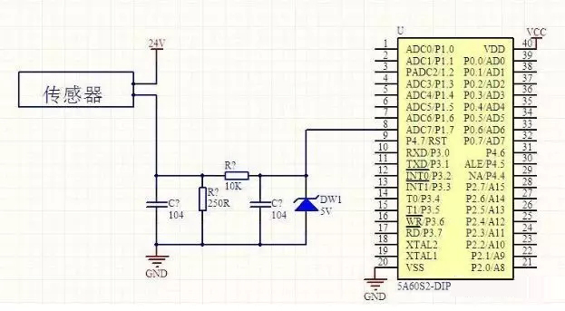 這張圖使用一個250歐姆的電阻將4到20mA的電流信號轉(zhuǎn)換成1到5V的電壓信號,然后使用一個RC濾波加一個二極管(原諒我模擬電路不好,并不知道是什么意思)接到單片機的AD轉(zhuǎn)換引腳。