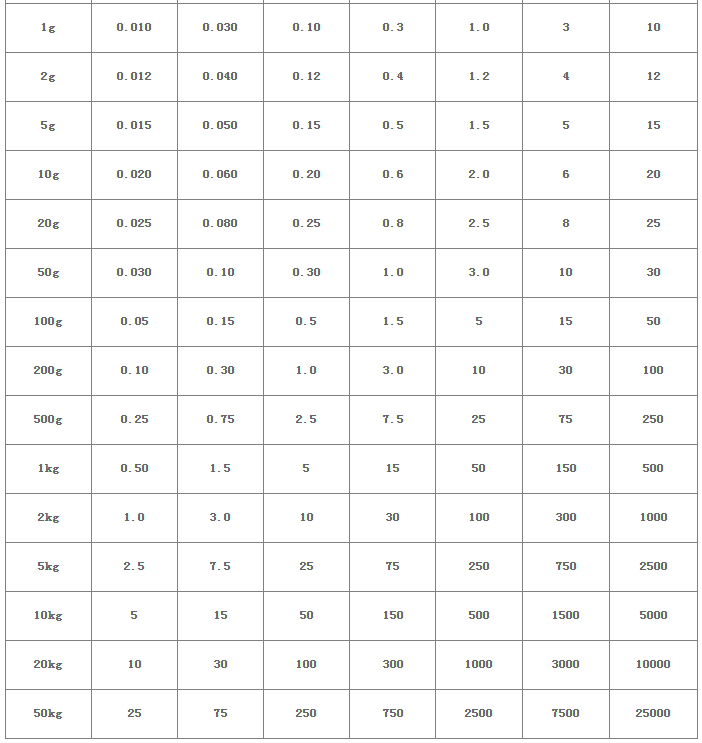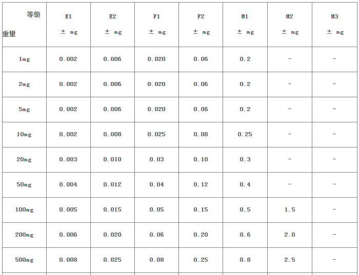 用戶可以根據(jù)此表選擇合適的校準砝碼。砝碼的誤差一定小于天平的分辨率。